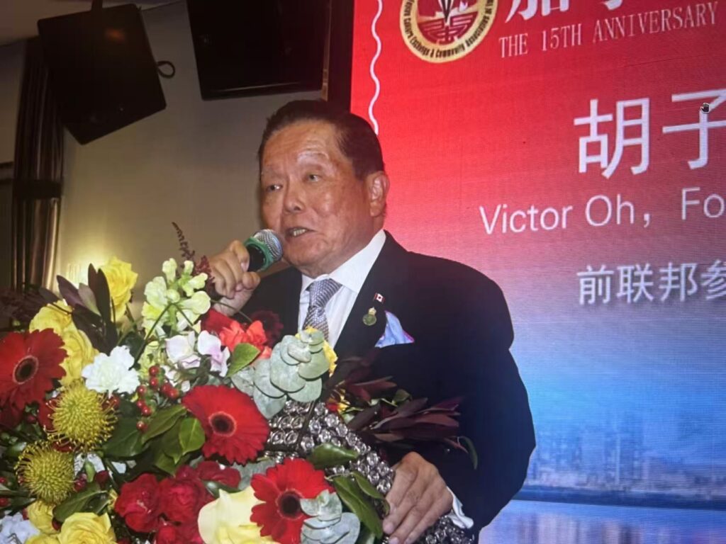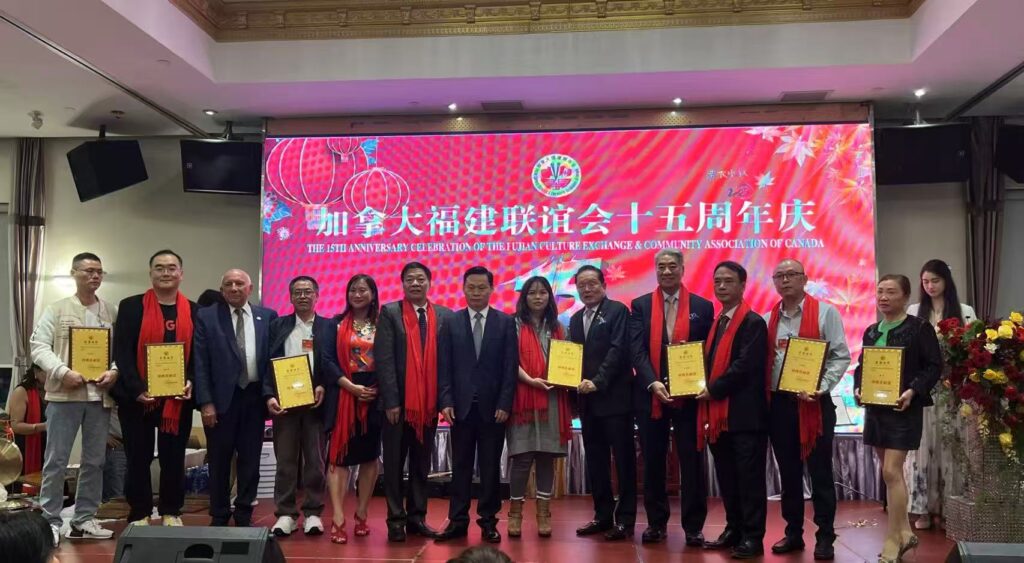 加拿大前联邦参议员胡子修在贺辞中赞扬福建联谊会十五年来在团结乡亲、促进文化交流与公益事业上的不懈努力,称其“为加拿大多元文化增添了亮丽色彩”。