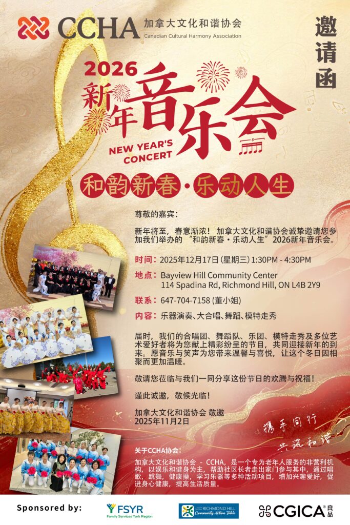 加拿大文化和谐协会(CCHA)举办“和韵新春·乐动人生”2026新年音乐会,将为观众呈现乐器演奏、大合唱、舞蹈及模特走秀等精彩的节目,以音乐和表演迎接新年,为社区带来温馨与喜悦。