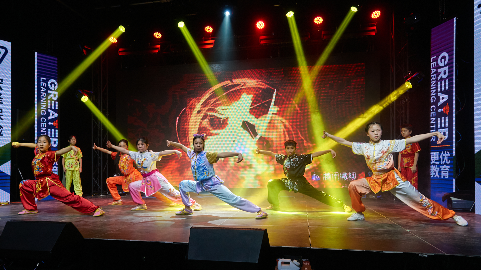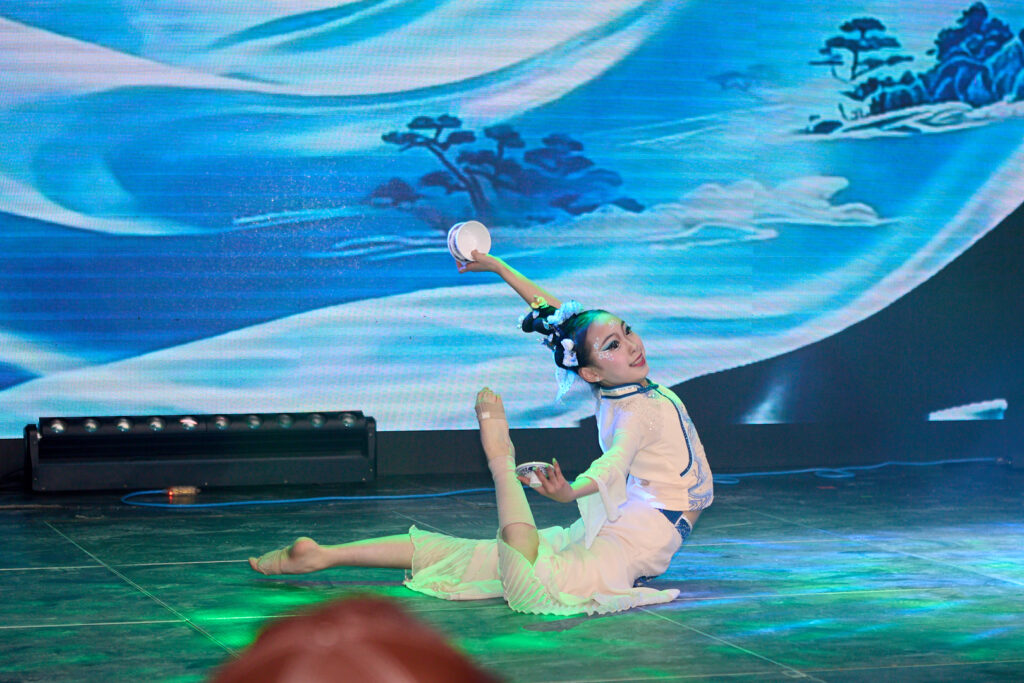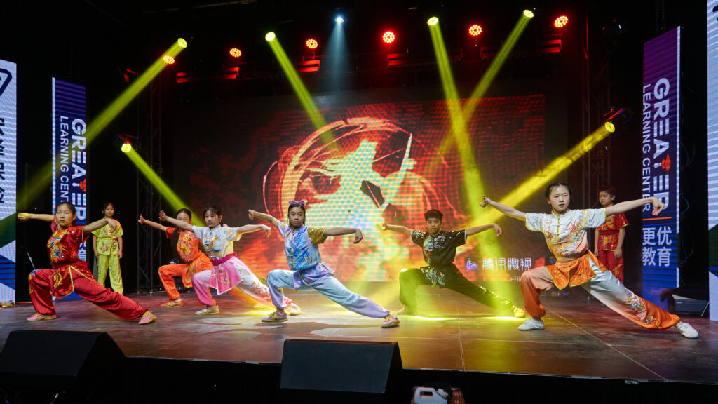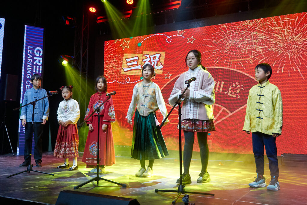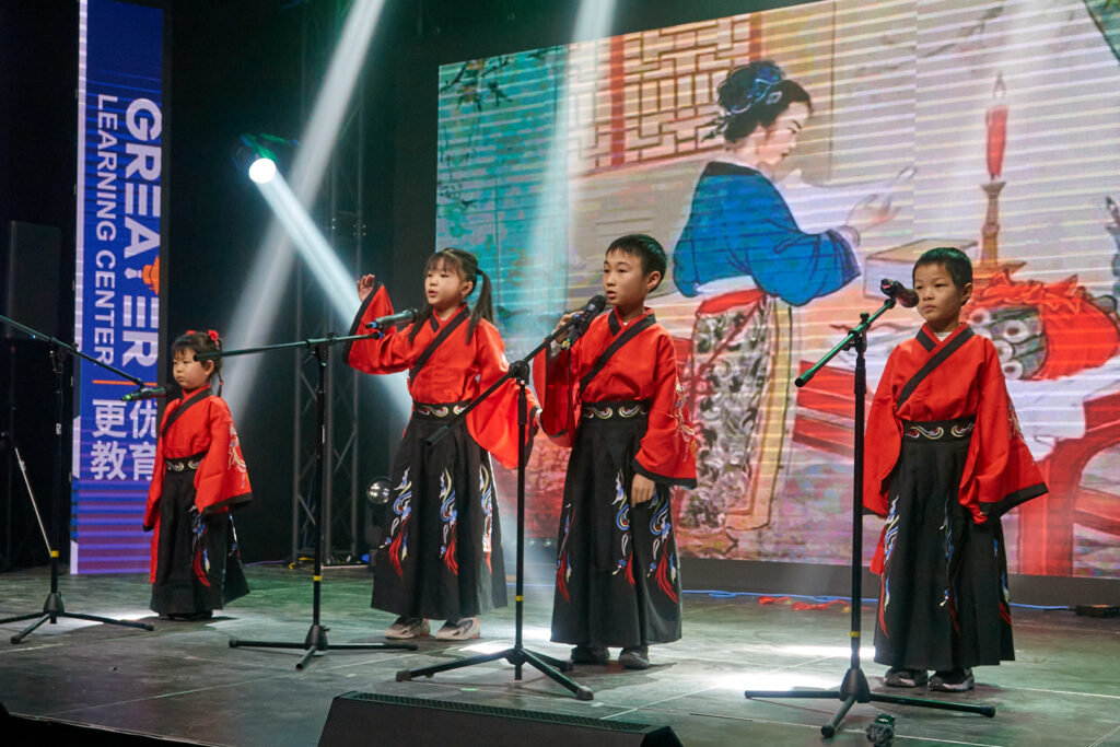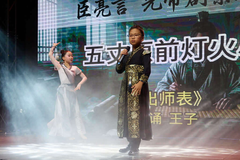 晚会同时充分展现了传统文化的深厚底蕴。气势磅礴的中国功夫秀令人热血沸腾;著名书法家李荣宗先生现场挥毫创作《岳阳楼记》,笔墨间尽显汉字艺术之美;琵琶演奏家杨小磊老师的精湛伴奏,则为古诗朗诵增添了穿越时空的韵味。压轴节目《古诗朗诵接力》中,二十多名孩子以接龙方式诵读经典,最小的演员仅两岁。朗朗书声气势如虹,象征着文化传承的接力棒在新一代手中坚定传递。