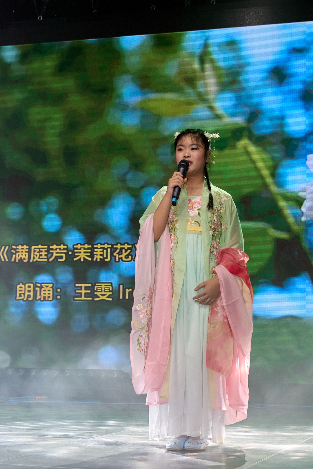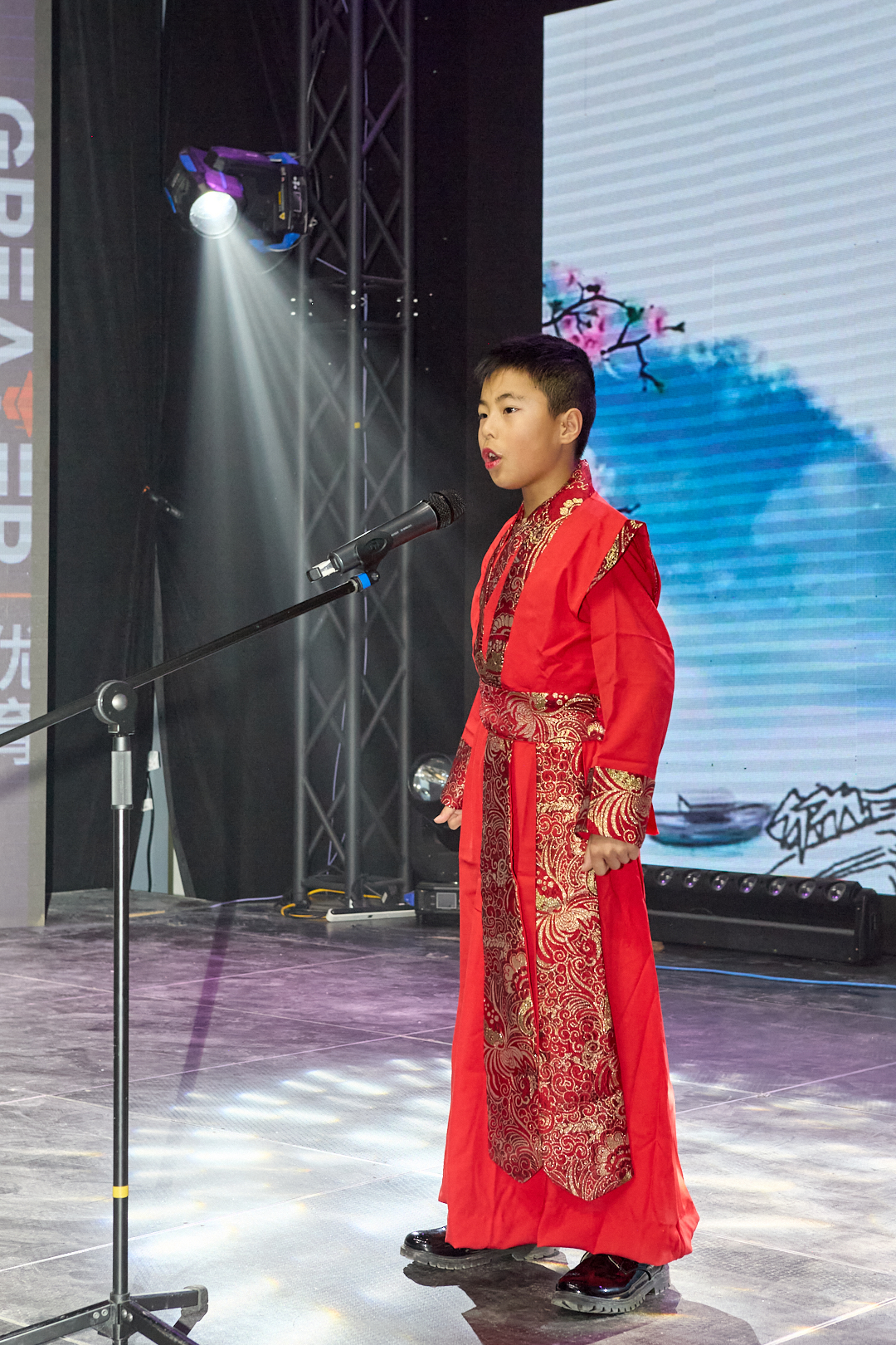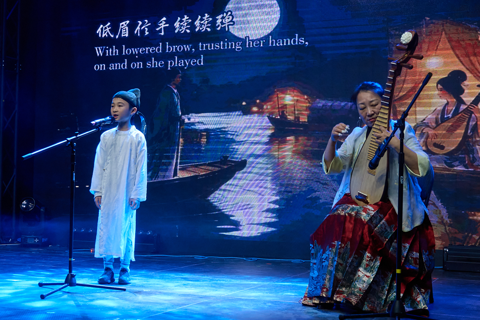 晚会同时充分展现了传统文化的深厚底蕴。气势磅礴的中国功夫秀令人热血沸腾;著名书法家李荣宗先生现场挥毫创作《岳阳楼记》,笔墨间尽显汉字艺术之美;琵琶演奏家杨小磊老师的精湛伴奏,则为古诗朗诵增添了穿越时空的韵味。压轴节目《古诗朗诵接力》中,二十多名孩子以接龙方式诵读经典,最小的演员仅两岁。朗朗书声气势如虹,象征着文化传承的接力棒在新一代手中坚定传递。