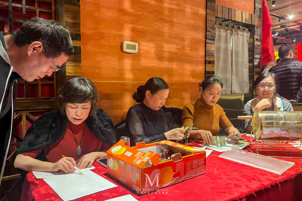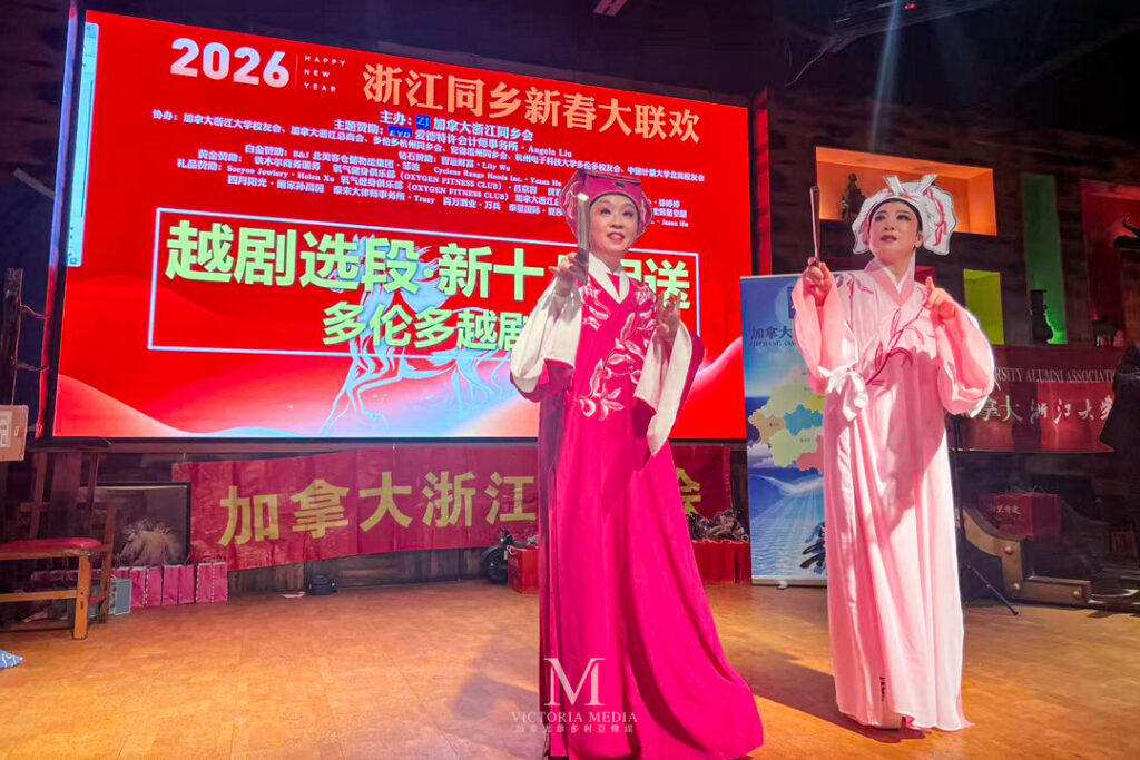 致辞环节后,列治文山市议员崔冰辉登台表演笛子独奏。两位乡亲对唱越剧《十八相送》,熟悉的唱腔引起台下共鸣。浙江省侨联为本次活动送来“浙里有爱”新春礼包。随后进行的抽奖环节,多位中奖者上台领奖。