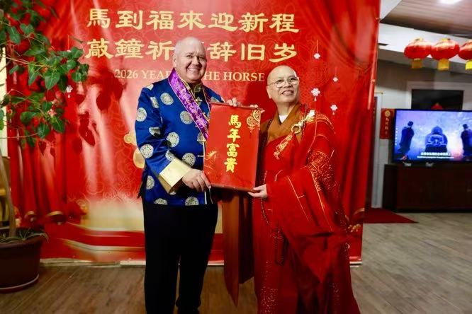“佛法讲‘和而不同、美美与共’,这与人类命运共同体理念高度契合。”达义大和尚在专访最后表示,未来他将继续带领僧众弟子,以法为桥,以心润世,让佛法智慧滋养更多心灵,让中华文化照亮海外大地,为中加文化交流、世界和平贡献自己的力量。就像今年马年除夕,他们在多伦多湛山精舍举办万人敲钟祈福盛典,钟声象征辞旧迎新,也提醒大众反观自心、净化烦恼,这正是他们一直以来的追求——让每一个人都能获得内心的安定,让这个世界更加和谐安宁。