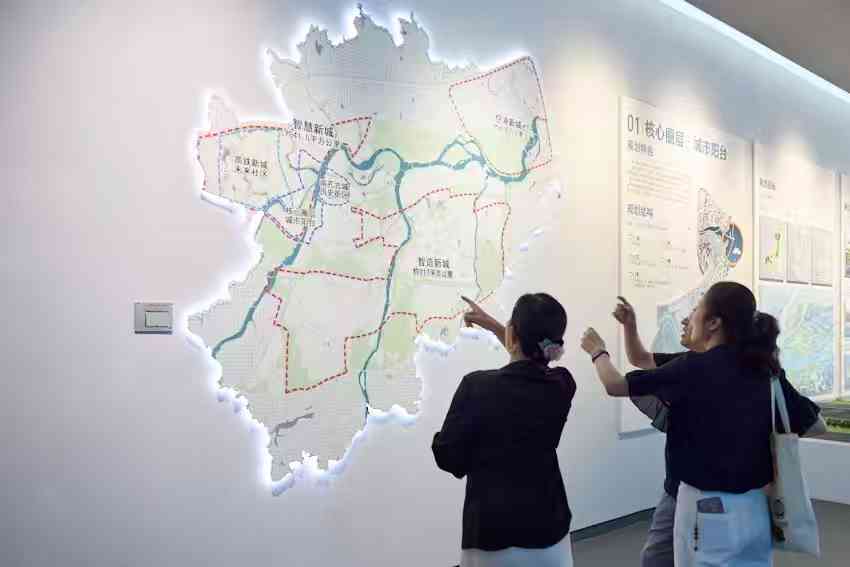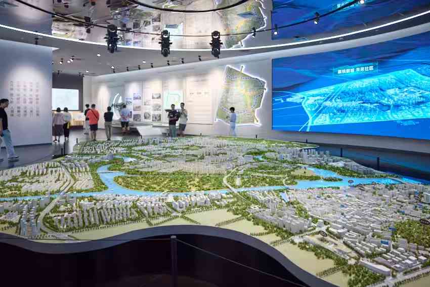 热爱舞蹈的民众在展厅前憧憬着未来的新市貌