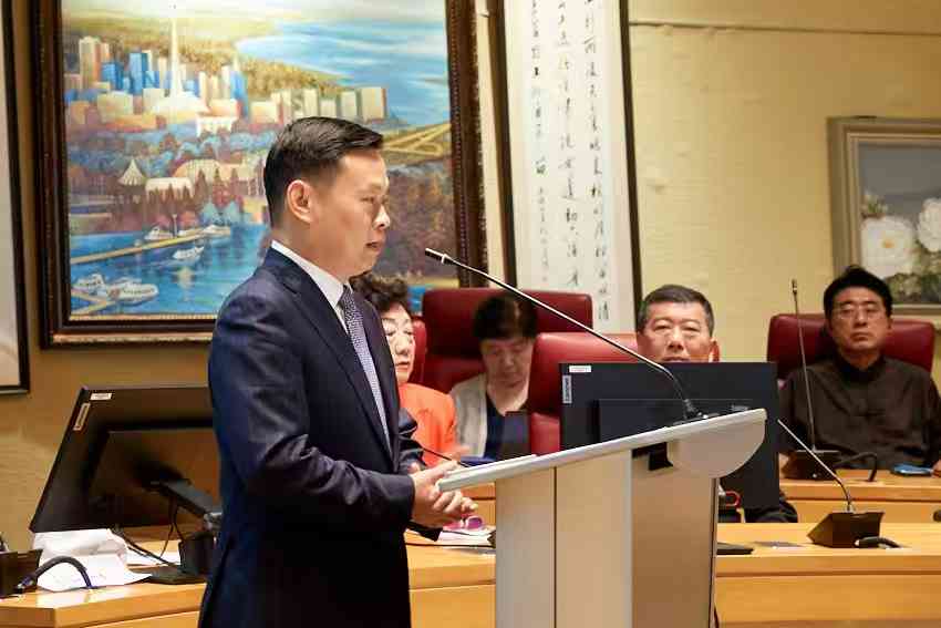 他呼吁铭记历史,反对任何歪曲侵略史实的行为,弘扬抗战精神。他说,回顾中国人民抗日战争的伟大贡献,是为了彰显维护二战胜利成果和国际公平正义的决心。他高度赞扬海外华侨华人在抗战中“毁家纾难、烽火归途”的赤子情怀,并指出抗战精神是中华民族“历经苦难而巍然屹立的根与魂”。 加拿大侨胞是促进中加友好、文明互鉴的桥梁,应共同反对霸权主义,推动构建人类命运共同体。