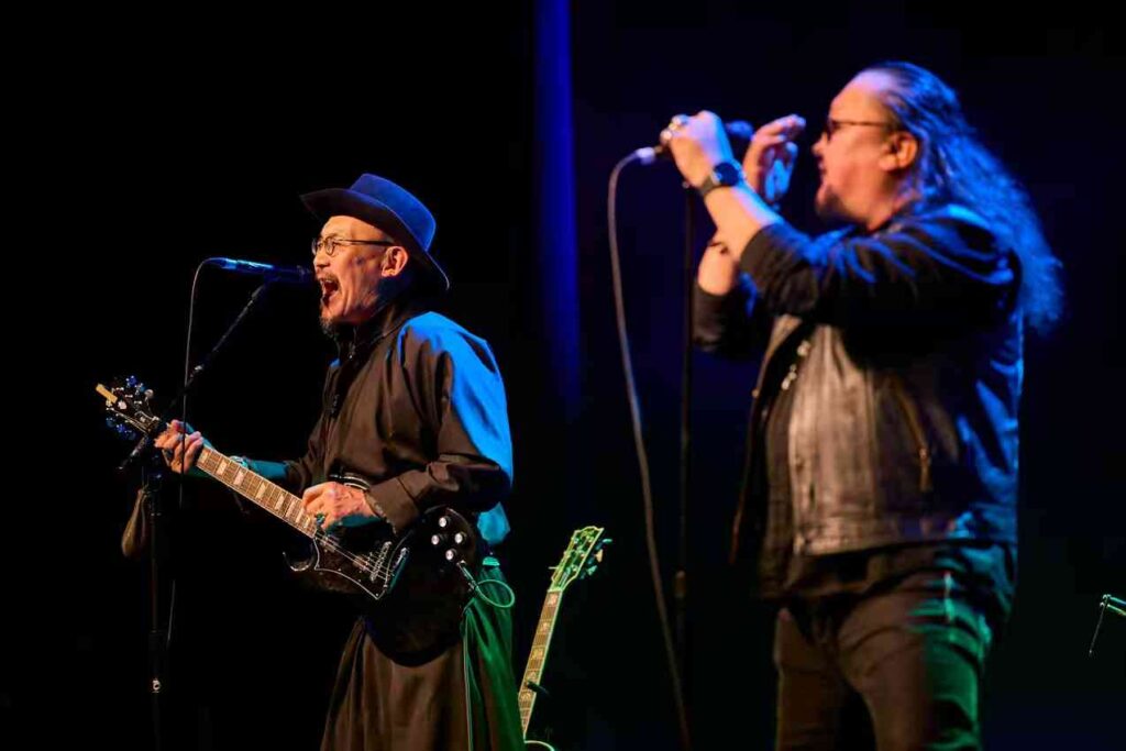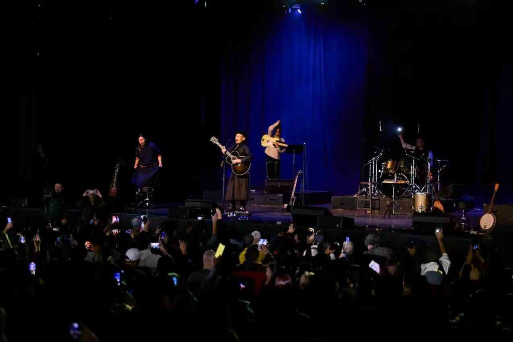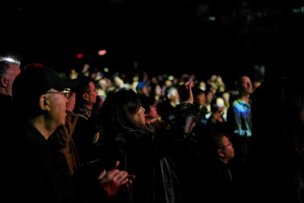在渥太华的收官之夜,现场气氛尤为感人。有忠实乐迷专程从多伦多追随而至,盛赞演出能量爆棚。更令人动容的是,两位盲人音乐爱好者也在工作人员的悉心协助下到场,近距离感受了呼麦等独特演唱技法的震撼,并与乐队成员进行了深入交流。当返场曲目《鸿雁》和《乌兰巴托的夜》响起时,全场观众自发开启手机灯光,汇成一片璀璨的“星河”,并集体起立合唱,将现场气氛推至最高潮。