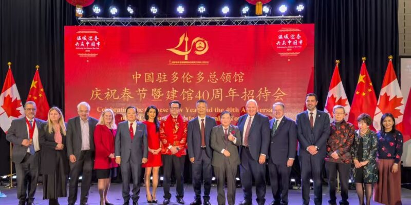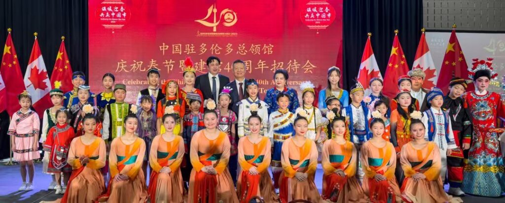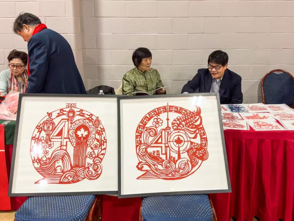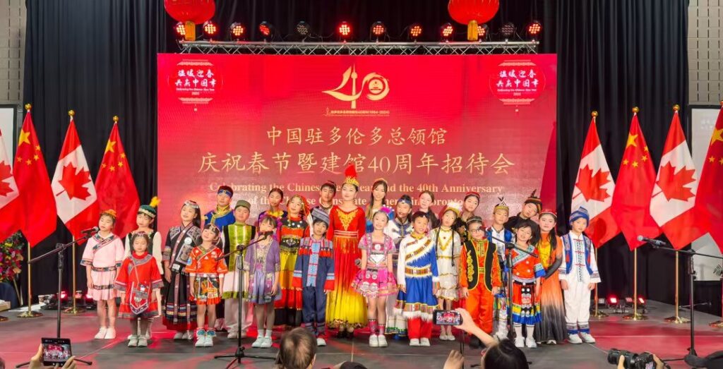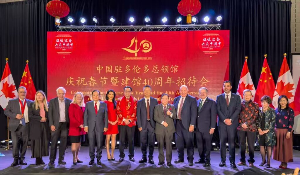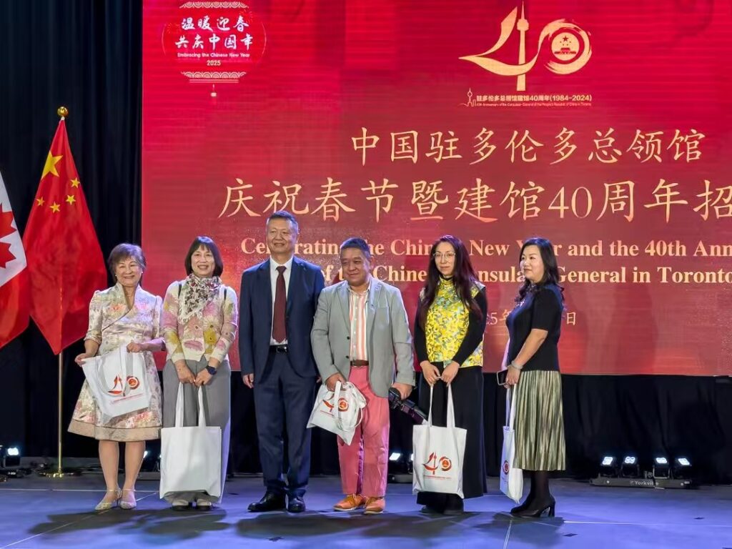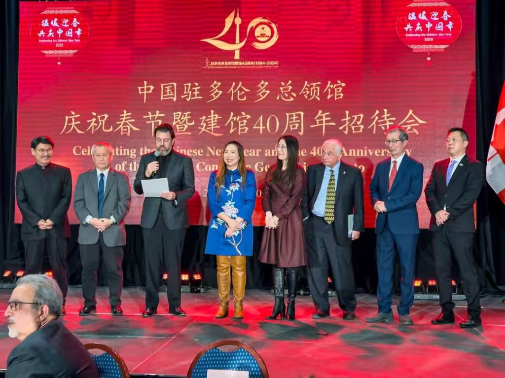 多伦多讯 记者燕雲吕欧图文报道 元月10日晚,中国驻多伦多总领馆春节曁建馆40周年招待会在大多伦多中华文化中心隆重举行,现场播放了建馆40周年纪录片《四十不惑 初心弥坚》,设置剪纸、书法、面塑等春节年俗展示区和新疆、西藏图片展。近600位来自各界的嘉宾沉浸在“祥龙贺岁辞旧去,金蛇纳福迎春来”的喜庆祥和的氛围中。