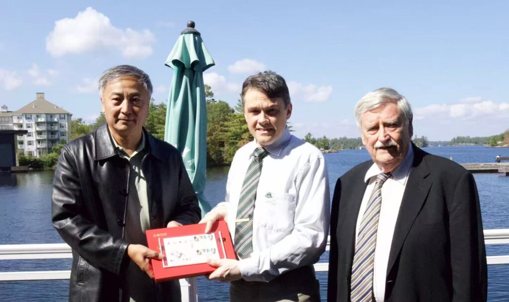 加拿大海峡文化交流基金会代表邢纪元向白求恩故居赠送1990年中国邮电部和加拿大邮政公司联合发行的白求恩诞生一百周年的纪念邮票。