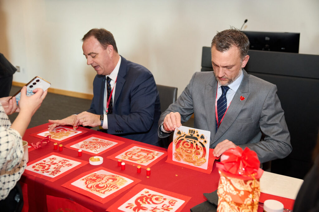 用红红的锦囊剪纸套在校徽上,合作办学没有迈不过去的关口。
