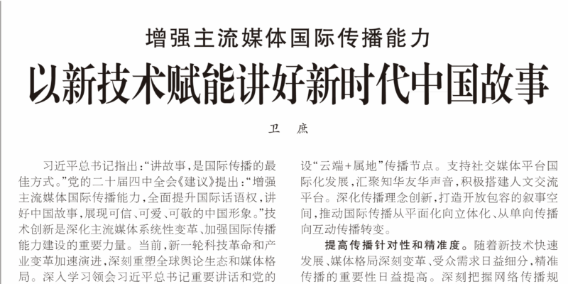 习近平总书记指出:“讲故事,是国际传播的最佳方式。”党的二十届四中全会《建议》提出:“增强主流媒体国际传播能力,全面提升国际话语权,讲好中国故事,展现可信、可爱、可敬的中国形象。”技术创新是深化主流媒体系统性变革、加强国际传播能力建设的重要力量。当前,新一轮科技革命和产业变革加速演进,深刻重塑全球舆论生态和媒体格局。深入学习领会习近平总书记重要讲话和党的二十届四中全会精神,要积极顺应新技术发展潮流,依托技术革新驱动主流媒体实现转型跨越,以新技术赋能主流媒体加强国际传播能力建设,更加主动地宣介中国主张、传播中华文化、展示中国形象,真实、立体、全面讲好新时代中国故事。