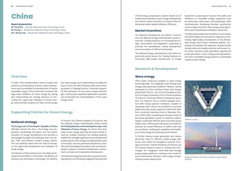 翻阅这份覆盖20个成员国和欧盟委员会的报告,一个清晰的趋势浮现出来:当大多数国家的海洋能源仍停留在政策规划或零散的项目试点阶段时,中国已形成了从顶层法律、跨部门规划到规模化示范项目的完整推进链条。报告明确指出,中国新实施的《能源法》首次在法律层面明确支持海洋能源规模化利用,由六个部委联合发布的《关于促进海洋能规模化利用的指导意见》则从资源评估、科技创新、示范项目到产业环境进行了系统部署。这种高层级、跨部门的协同推进力度,在报告的各国章节中并不多见。