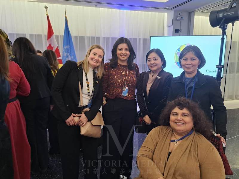 作为加拿大代表之一,余承璋(图左三)以联合国“代际平等联盟决策团队成员”、 “全球妇女和平建造者联盟领导成员”及可持续发展资深研究员身份出席盛会。3月9日晚,她应邀出席了在加拿大驻联合国总部举行的官方招待会,是与会代表中唯一的华人学者。在交流中,她分享了自身近三十年来为妇女权益发声的实践经验:从1998年创刊主编华人妇女刊物《百合花》并定义其社会功能,到作为学者研究参与商讨修订1999年《北京宣言》及2021年巴黎会议协议。她亲历并见证了联合国及妇女署各项提案的协商过程,以及从地区、国家到全球范围的社会变迁。