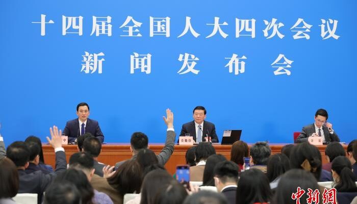 3月4日,十四届全国人大四次会议在北京人民大会堂举行新闻发布会。大会发言人娄勤俭就大会议程和人大工作相关问题回答中外记者提问。 中新社记者 蒋启明 摄